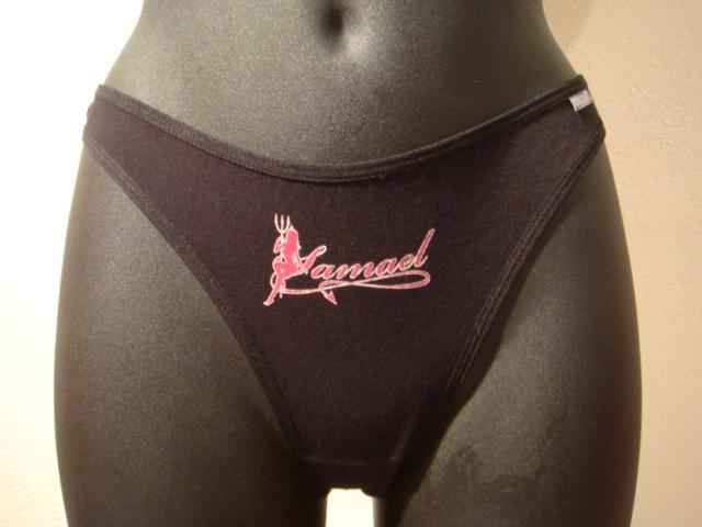 Black string with S A M A E L in special “devilish” lettering printed in pink on the front