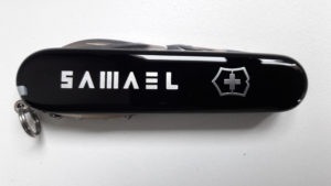 SAMAEL Vicotinox Swiss Knife High quality knife, black with S A M A E L logo printed in silver. A pocket survival kit with two blades, can and bottle opener, corkscrew and more…