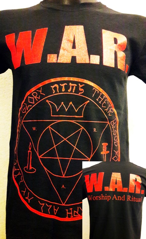 Black T-Shirt with W.A.R. logo printed in red on the front and W.A.R. – Worship And Ritual printed in red on the back